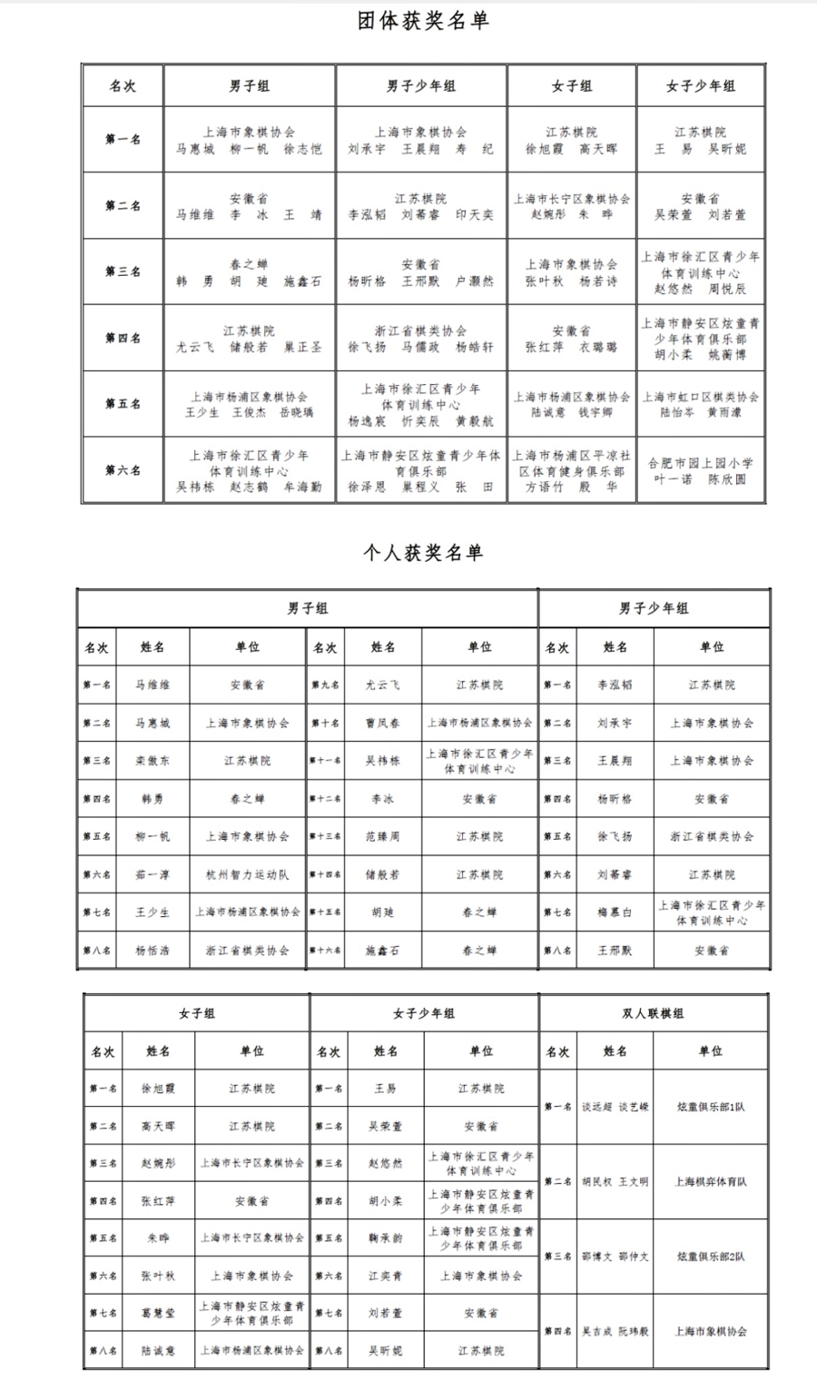 11月1日和2日,第五届长三角体育节象棋比赛在上海棋院进行,共有来自江苏、浙江、安徽和上海三省一市21支队伍近200名棋手参赛,在楚河汉界之上展开智慧交锋。经过两天紧张激烈的比赛,各组别决出最终名次。在男子团体组,上海市象棋协会队、安徽省队和春之蝉队获得前三名。在女子团体组,江苏棋院队、上海市长宁区象棋协会队和上海市象棋协会队位列前三。