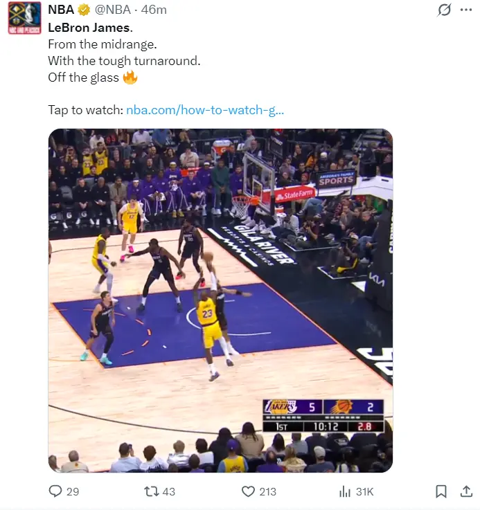 第二节太阳两次拉开到13分都是詹姆斯的三分球去续命,他多次冲击篮下造犯规但罚球的效率很低,单节7中4,三分3中2,罚球9中4,拿到14分2篮板,半场詹姆斯18分3助攻2篮板0失误,湖人还是落后10分之多。