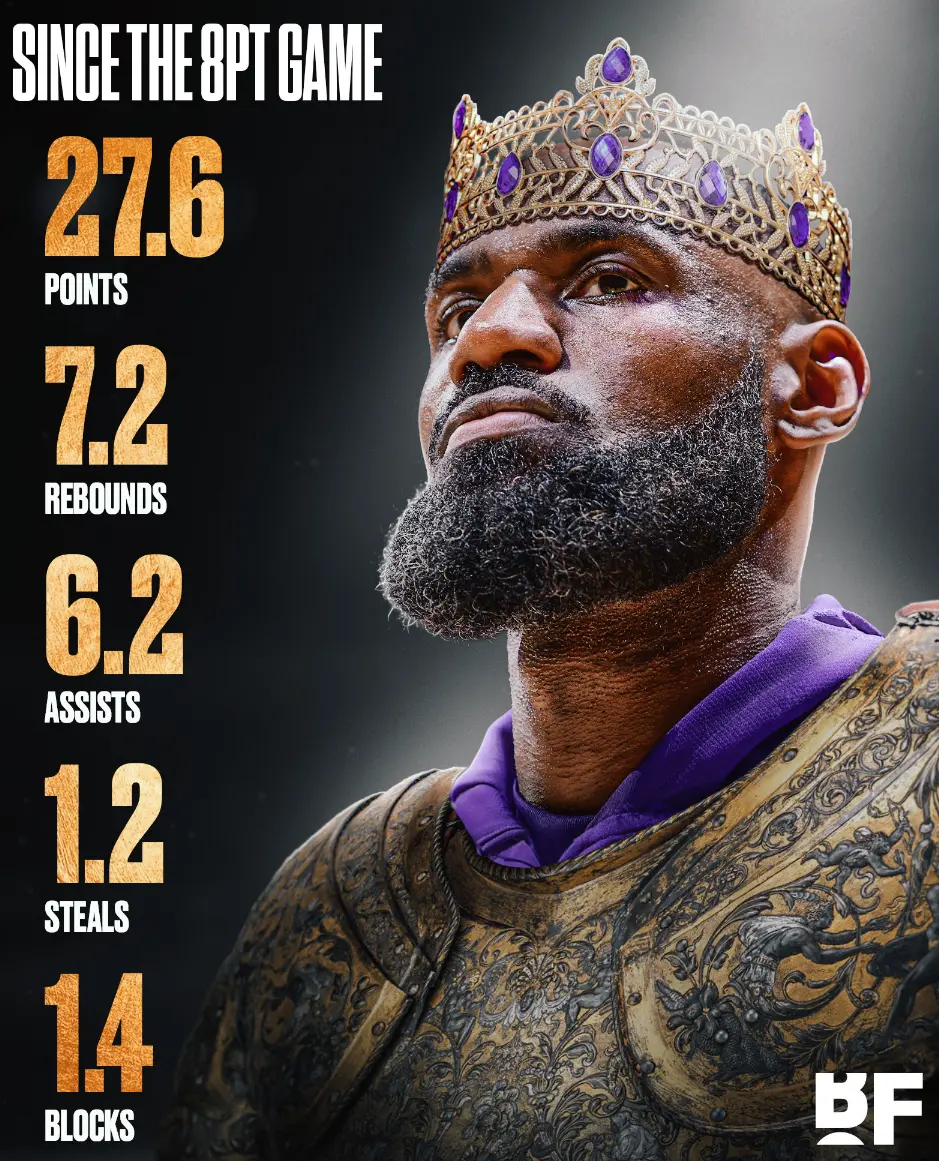 美媒BF晒出在詹姆斯连续得分上双的纪录中断后,詹姆斯是场均27.6分7.2篮板6.2助攻1.2抢断1.4盖帽,即将年满41岁的勒布朗仍旧有出色的竞技状态,他目前又回到场均20+5+5的数据。